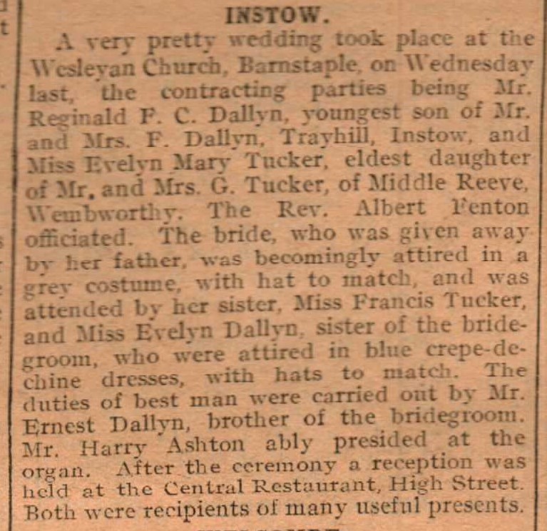 Mr Reginald Dallyn (Instow) and Miss Evelyn Tucker are married.