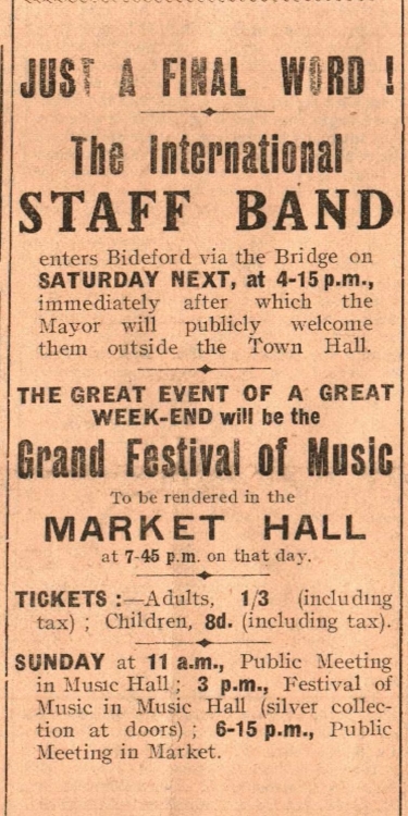 Births, engagements and marriages – a son to Mr and Mrs Cox of 5 Richmond Terrace, Bideford; a daughter for Mr and Mrs A E Fulford; Skinner-Palmer – Henry John Skinner to Ethel Mary Palmer, youngest daughter of Mr and Mrs J Palmer, Woodville Cottage, Orchard Hill; a son to Mr and Mrs A F Capern, Kimberley, British Columbia, Canada; Greenslade-Storey – Sydney, son of Mr and Mrs Greenslade, Bridgeland Street, to Edith, eldest daughter of Mr and Mrs R Storey of Brixton; a daughter to Mr and Mrs Parkhouse, Myrtle Cottage, Appledore; Yeo-Glover – Mr E William Yeo, son of Mr and Mrs Yeo of Instow, to Miss A Kathleen Glover, second daughter of Mr Henry Glover, of Abbotsham Road; at 5 Bay View Terrace, Northam, a daughter to the wife of Thomas Oerton; a daughter to Mr and Mrs G Hill, Bridge End, Bideford; Steeksma-Small – Lieut Ernest Steeksma (Tank Corps) to Elizabeth (Trilby), younger daughter of Mr and Mrs A Small, of Appledore; a son to Mr and Mrs Thomas Williams (nee Maud Newcombe).
