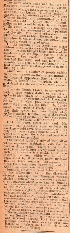 The Appledore motor lifeboat was put to its severest test since its commission a few months ago when, in the early hours of Sunday morning, a call was received to proceed to the s.s. Kirktown, a steamer of 1,500 tons, which was supposed to be ashore on Lundy Island.