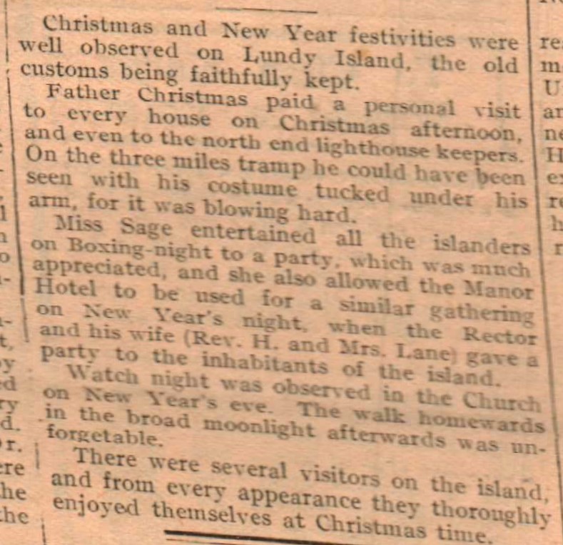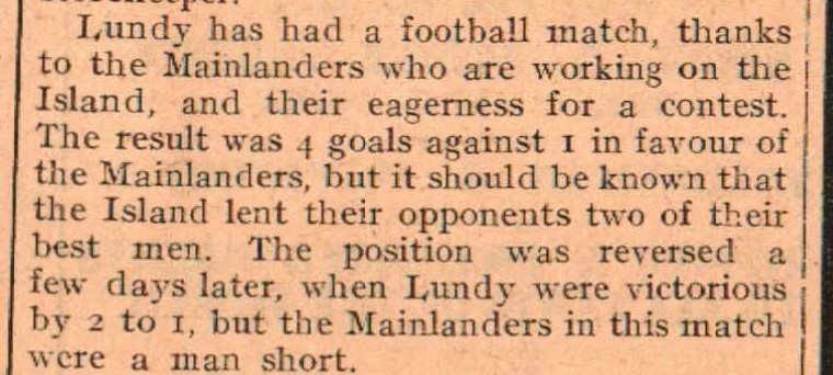 Mr Splain, Chief Officer of Coastguards, is about to leave Lundy, much to the regret of the inhabitants. There were twenty entries for a recent bagatelle tournament. The first prize was won by Mr Maskell, of the South Lighthouse, and the second by Mr Lang, the storekeeper.
