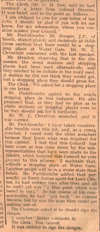 The question of signing a cheque for £1,200 in respect of the third call of the Torrington Halwill Light Railway scheme, came up for consideration at a meeting of Torrington Rural Council. Mr Puddicombe said that, before they signed the cheque, he thought they should make a protest. There was still nothing definite about the accommodation they were going to get at Water Gate, the Council should in making a protest insist, as they were big subscribers, on getting a plan to find out where the proposed stopping places were to be provided.