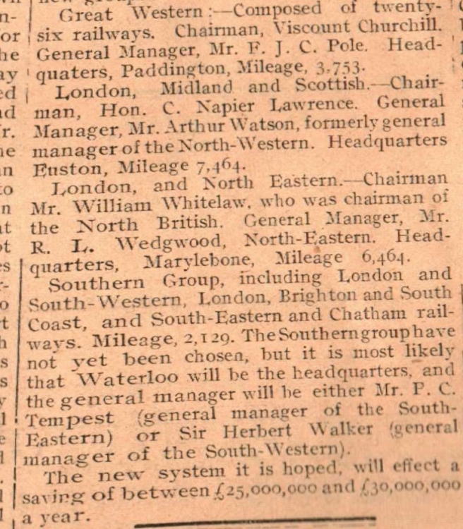 The first day of 1923 saw the dawn of a new era in railway travel. On that day the ninety-three railway companies of Great Britain were reduced to four groups. The following are some of the facts of the four new groups.