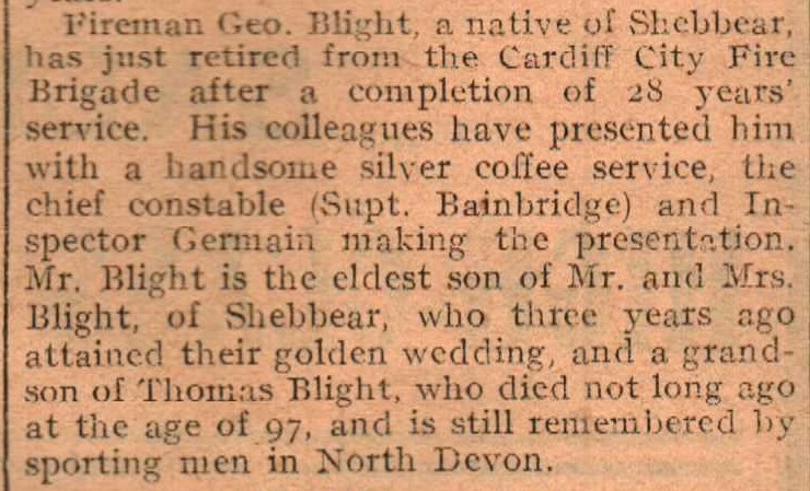 Fireman George Blight, a native of Shebbear, has just retired from the Cardiff City Fire Brigade.