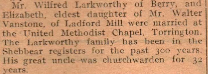 Wilfred Larkworthy and Elizabeth Vanstone marry at Torrington.