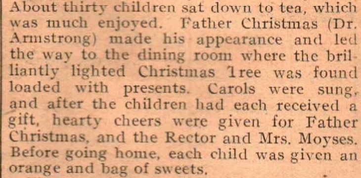 A tea and concert arranged by the Rev J W Mayo have been given to the inmates of the Torrington Union. The tea, which was much appreciated, was followed by a concert. Afterwards came a well-laden Christmas tree, arranged by Mrs Mayo, Mrs Stormer, Miss Barrow and Mrs Dymond. Each inmate was presented with a gift from the tree. Rev Mayo expressed his thanks to the Master and Matron, Mr and Mrs Harrison, for their hearty cooperation.
