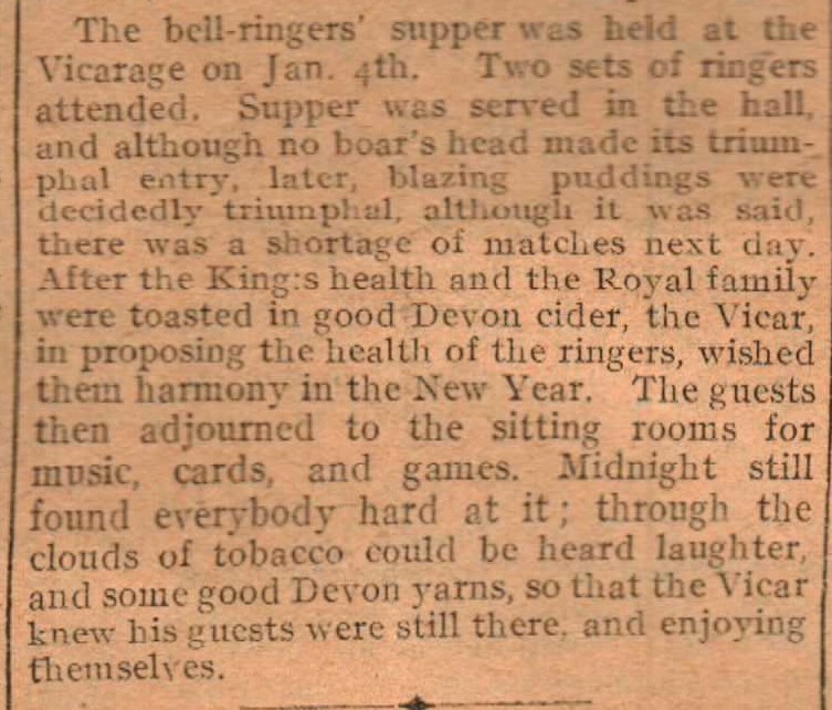 There was a good muster of ringers at All Saints’ Church, Clovelly, on New Years’ Eve. The Old Year was tolled out and the New Year ushered in with merry peals. The Rector, Rev TL Simkin, was present and exchanged New Year’s Greetings with the ringers and others present.