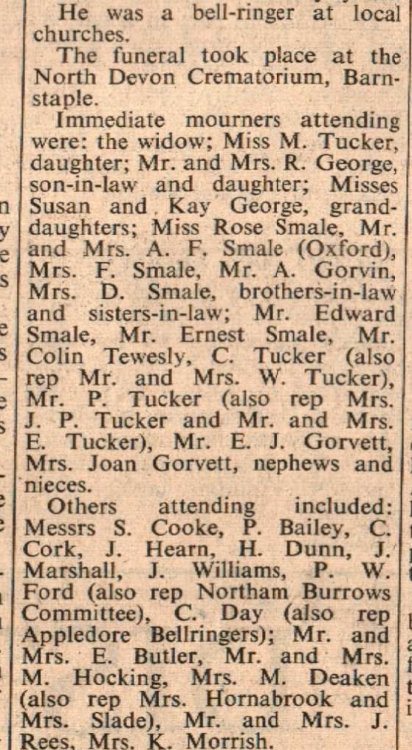 For many years a member of Northam Burrows Committee, taking a prominent part in organising the revival of ‘potwalloping day’ to strengthen the pebbleridge in 1957, Mr Charlie James (Jim) Tucker has died at his home, 40 Western Avenue, Appledore. He was 69. Before his retirement through ill-health he was an agricultural worker and was employed at Watertown farm for many years.