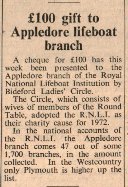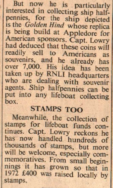 Capt Colin Lowry of Buckleigh has hit upon another productive idea. It is a follow-up of his previously announced collection of pre-decimilisation coins which he turns into cash in £1 lots. Already he has sent off several hundred weights of old coppers to the Royal Mint via RNLI headquarters, and he is convinced there are many more about in boxes and drawers in homes. But now he is particularly interested in collecting ship halfpennies, for the ship depicted is the Golden Hind.