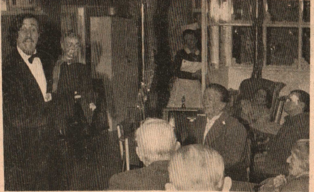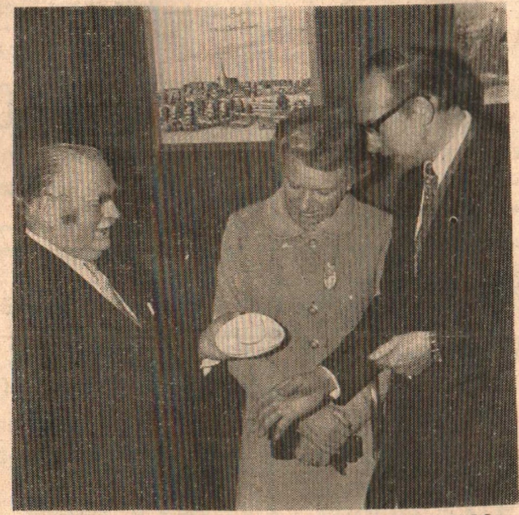 Mr Alfred Short hands to the Mayor and Mayoress of Bideford, Mr and Mrs J W Needs, a china replica of the famous Calgary Stetson, sent by the Mayor of Calgary in reply to a letter of civic greetings from Bideford taken to that city by Mr and Mrs Short on their recent Canadian visit. Mr Short, now in his 70s, is an Old Boy of Bideford Grammar School. On his retirement he was Bristol district territorial general manager for Boots Chemist.