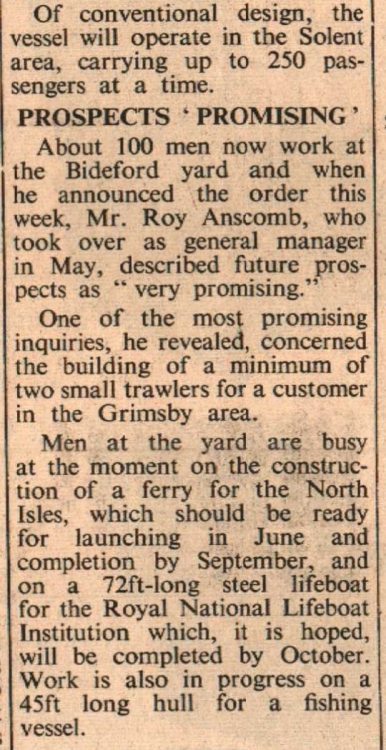 Bideford Shipyard Ltd announced that they have secured a new order worth between £70,000 and £80,000 to build a 90ft long passenger vessel for the Blue Funnel Cruises Ltd of Southampton. Work on the new vessel, which will be the longest built at the Bideford yard, is expected to start in March. Completion will take about 12 months.