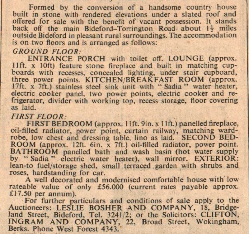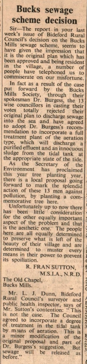 Bideford Rural Council are to go ahead with their scheme to pump sewage into the sea at Bucks Mills subject to aeration modifications as suggested by Dr S C Burgess, a member of the Jeger committee. Later in the month, R Fran Sutton of The Old Chapel wrote to the Gazette.