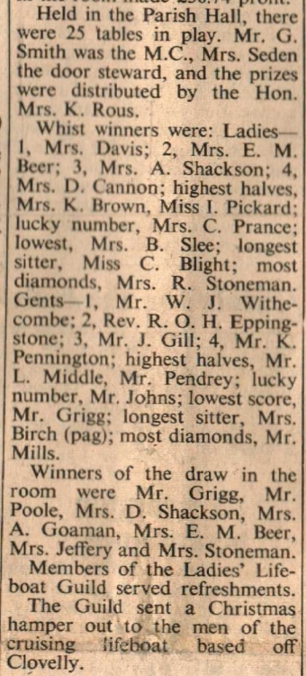 At a whist drive in aid of Clovelly lifeboat funds the draw for a table light in the form of a ship, made by Mr C Shackson for the last time, was won by Mrs A Shackson. Many of the other prizes in this special draw run from the lifeboat house throughout the summer went up country. The effort made a profit of £94.58½. The whist drive and a draw in the room made £36.74 profit.