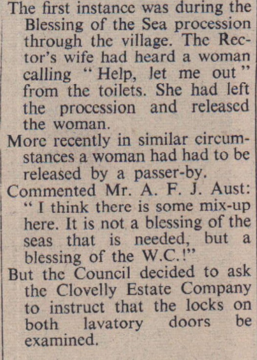 Dear, dear what can the matter be? Clovelly Parish Council have been told about ladies who got locked in the lavatory. One each occasion it was the public lavatory near Temple Bar, said Miss Sheila Ellis.