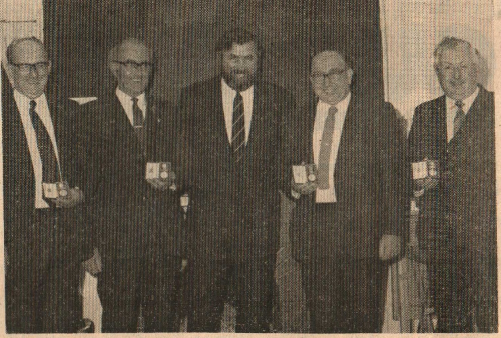 Four members of the Hartland Auxiliary Coastguard rescue section have received 20 year long service medals. They are Messrs Reginald Johns, Wilfred Pennington, Kenneth Johns and Richard Wakeley. S R Richards presented the medals.