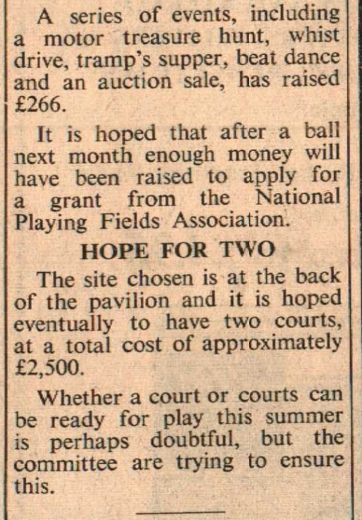 With the aim of raising money for provision of hard tennis courts in Hartland, a sub-committee of the local Playing Fields Association was formed last summer. A canvass by circular in the district established that there was a call for tennis courts, which have been in the thoughts of the Playing Fields’ Association for 10 years. But funds have been needed for other facilities, such as the football field, children’s playground and the pavilion, plus maintenance costs, and it has not been possible to concentrate on providing for tennis until now.