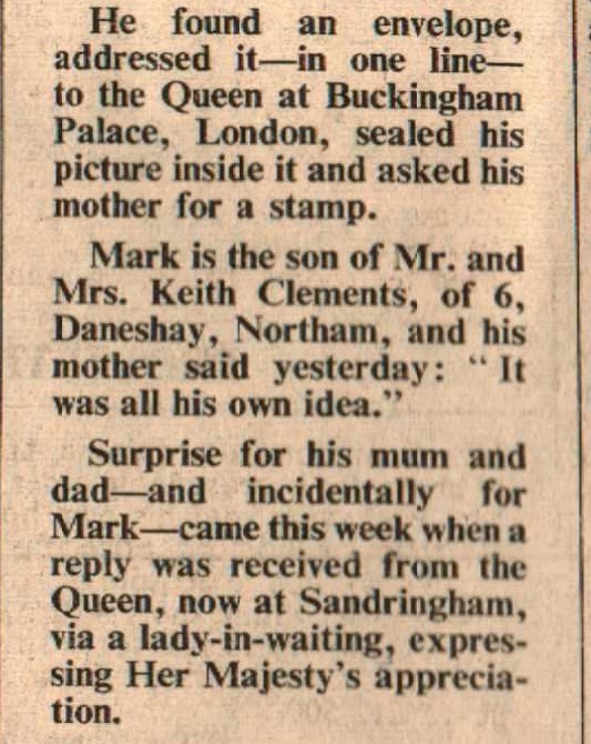 Six year old Mark Clements liked his picture of the Queen so much that he decided to send it to her. He is the son of Mr and Mrs Keith Clements of 6 Daneshay, Northam.