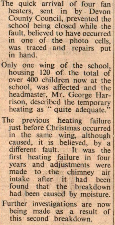 Over 100 children at St Margaret’s School, Northam, had to wear their overcoats in class for a time this week when the electric heating system in one wing went out of action for the second time in two months.