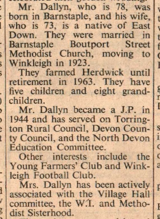 Mr and Mrs R F C Dallyn, of The Mount, Winkleigh, have celebrated their golden wedding. The anniversary was celebrated with a party at Beaford House Hotel.