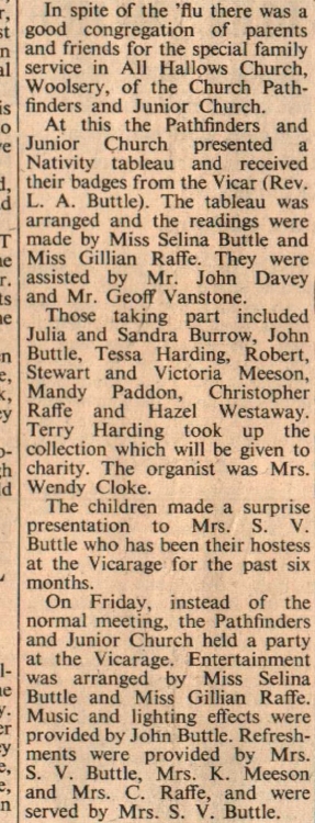 A lamb at Mr Andrews’ Putshole, Langtree, born in December, is believed to be the earliest in the district. The carol singers on Christmas and New Year’s Eve collected over £3 to be sent to the Starving Childrens’ Fund. Mrs Jones, wife of Mr P B Jones, Chairman of the Parish Council, has badly dislocated her foot. All wish her a speedy recovery.
