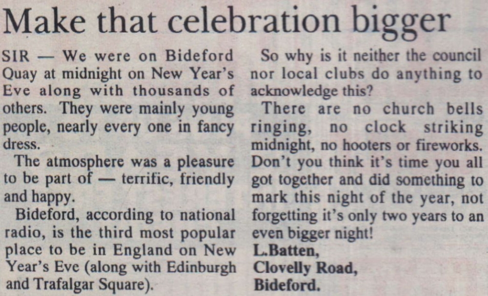 Bideford is fast becoming the centre of New Year's Eve celebrations in North Devon with some 2,000 revellers congregating on its quayside to welcome 1998. Clowns joined in the New Year fun in the form of Ray Martin, Yvonne Sheridan, Sharon Martin and Kevin Dalling. And Mr Batten wants the celebration even bigger!