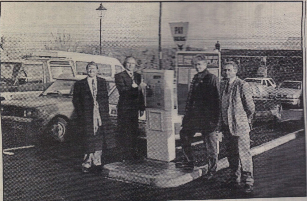 A new car park extension with pedestrian access to the town's Panner Market has been officially opened in Bideford. The £400,000-plus project has provided 60 extra parking spaces on a three-level hillside site in Honestone Street and a walkway directly into Market Place. The picture shows Mr Rowe putting his coins into the Pay and Display machine at the new car park, watched by district council chief executive Richard Brasington and Colin Ayres and Peter Hilson.