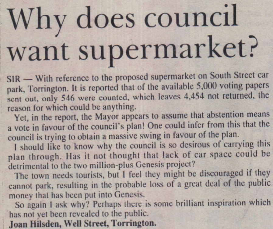 Joan Hilsden, Well Street, Torrington, is concerned about the voting process for the proposed new supermarket on South Street car park.
