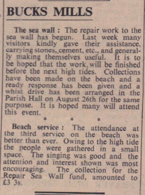 Accompanying pictures show how ‘self-help’ by inhabitants of Bucks Mills has met the menace of the high seas which threatened to destroy the only slip-way.