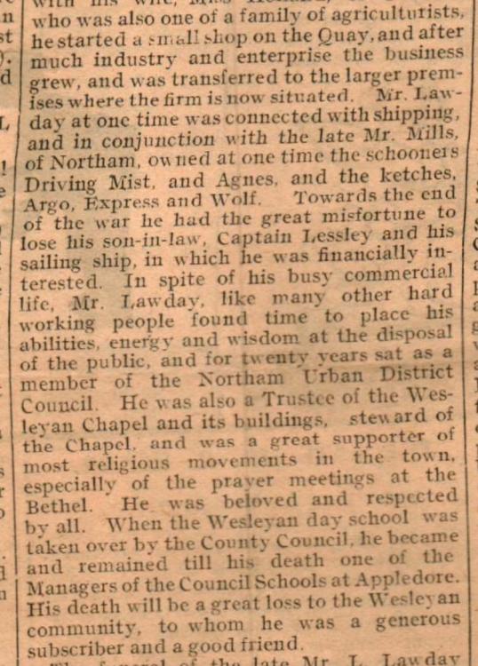 Mr Lewis Lawday, one of the prominent tradesmen of Appledore, died after a few days illness. He was a native of Bishop Nympton and after following the pursuits of farming he was attracted to Appledore, which was then at its zenith in shipbuilding. He reached Appledore at the age of 21 and joined Mr Klibbet’s shipbuilding yard. Meanwhile in conjunction with his wife, Miss Holland, of Yelland…. The funeral was largely attended, and flags on the ships in harbour were at half-mast, as well as the flag at the Sailors’ Rest. A short memorial service was held in the Wesleyan Chapel, previous to the cortege leaving for Fremington for the interment.