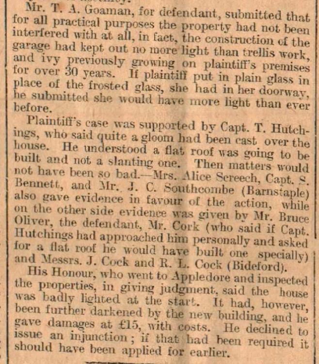 His Honour Judge Lindley was engaged for two and half hours at Bideford County Court in hearing an action in which Mrs Annie Hutchings sought an injunction against and £50 damages from Mr George Cork farmer, of Appledore, in respect to the erection of a garage which, she alleged, had kept out the light from rooms at The Myrtles, Appledore, thereby causing extra expense in artificial lighting, discomfort, and depreciating the value of the property. Mr G F Lefroy, appeared for plaintiff, and said what Mr Cork had done was regarded as an unnecessary act of hostility.