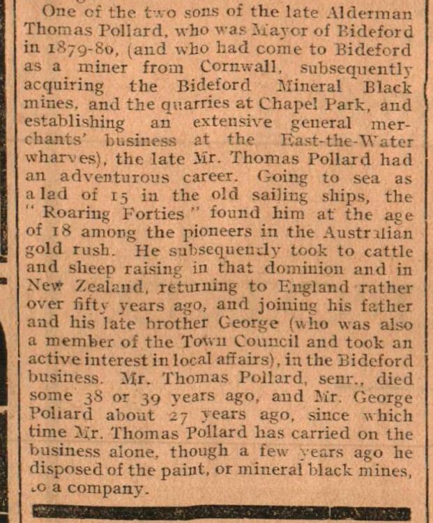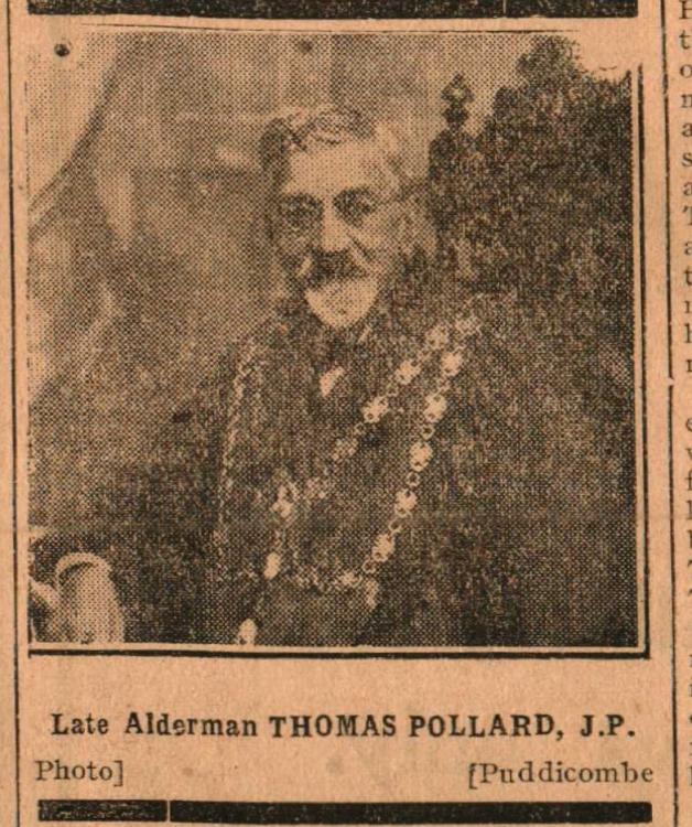 By the death of Alderman Thomas Pollard, JP, which took place at Carlton House, The Quay, Bideford has, within the space of a few weeks, lost the second of the five honorary freemen it made a little over six months ago. Although in failing health for some time, Mr Pollard, who was in his 87th year, and a native of Bideford, had only been confined to bed for a few days over a fortnight.