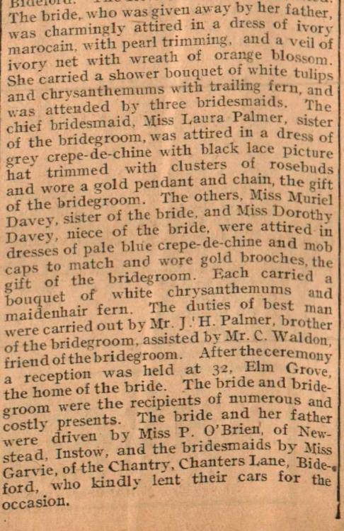 A very pretty wedding was solemnised at St Mary’s Church, Bideford, the contracting parties being Miss Olive May Davey, eldest daughter of Mr and Mrs B Davey, 32 Elm Grove, and Mr Reginald Palmer, youngest son of Mr and Mrs J Palmer, of Woodville Cottage, Orchard Hill. The Rev C B Crofts officiated.
