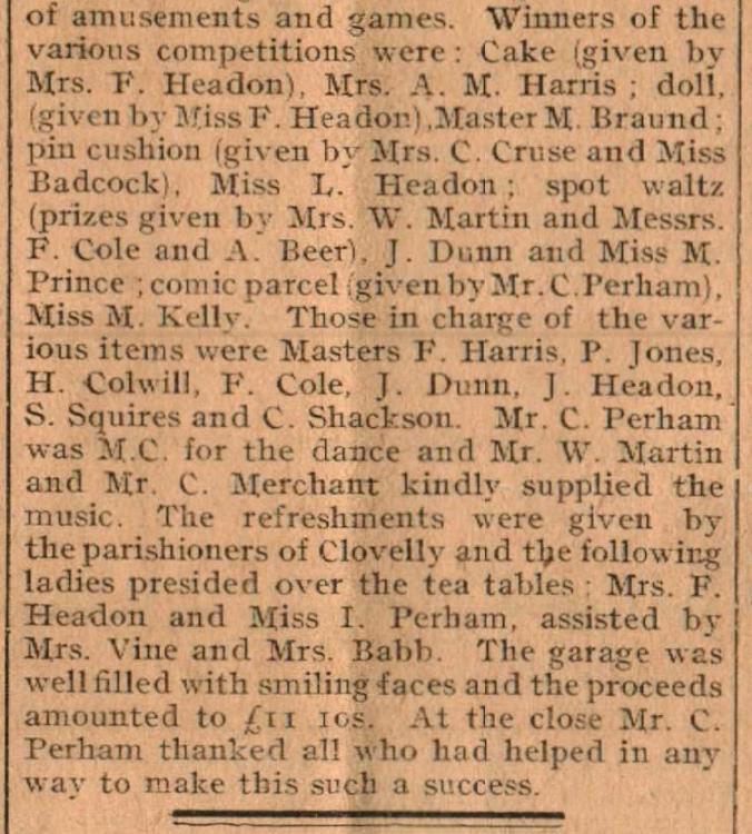 A very successful social was held in the New Inn Garage, Clovelly, kindly lent by Mr Bushell, on New Year’s Night, in aid of the Bideford Hospital. The garage was gracefully decorated with flags kindly lent by Mr Somerville. Winners of the various competitions were: