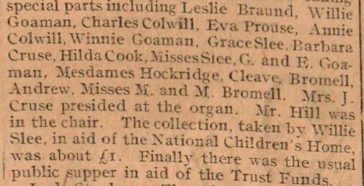 The Young Men’s Club held a dance in the Church Room. Pianists were Misses Leake Burrow, F Clay, Bertha and Gertie Pillman. Refreshment helpers were Misses Lottie Burrow, F Colwill and E Heywood. Mr H Prust was MC.