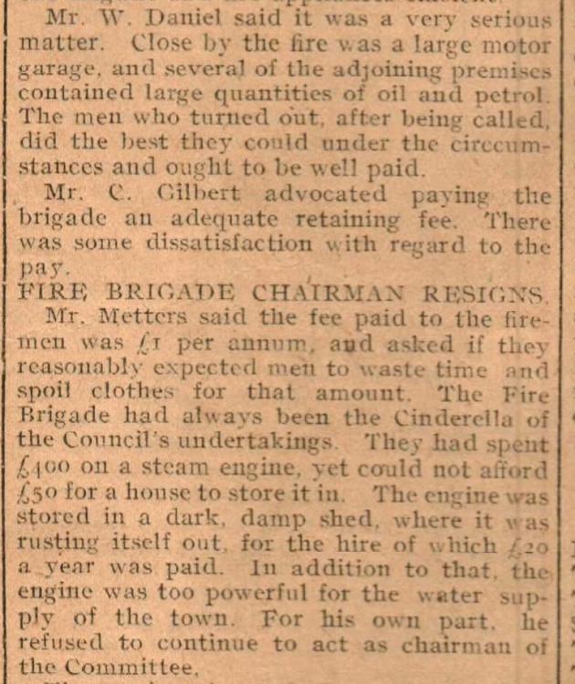 Mr A J Metters, chairman of the Fire Brigade Committee, reported to the Holsworthy Urban Council, that at the fire which occurred in a shed at the rear of Market-square, at 4am, not a single member of the fire brigade, and very few others heard the fire bell and when the brigade got to work it was found that the supply of hose was only just sufficient to reach the fire. It was a warning to the Council that something must be done to make the brigade and fire appliances efficient.