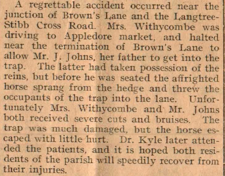Mr G W F Brown, the North Devon Coroner, returned a verdict of ‘accidental death’ in the case of Weare Gifford labourer, James Priest, 73. C H Tucker, labourer, who identified the body, said deceased left his house (where he had lodged for over three years past) about 9am to do work for Mr Hancock of Weare Gifford. He was carrying a scythe for lawn mowing. Deceased had, as far as he knew, no relatives, was a widower, and had no children. Mr R C Powell deposed to seeing Priest grinding his scythe on his stone in his orchard about 11.30. At the time deceased appeared cheerful and after passing a few jokes he (witness) left with one of his men, C R Clarke, who had been helping with the grinding. Deceased probably intended taking a short cut by way of a field. F C Slee stated that about twenty to twelve he came across the deceased.