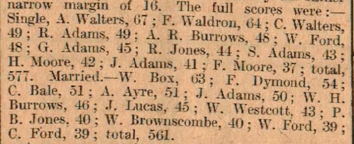 A very pleasant and sociable married v. single skittling match took place in the Langtree church room alley in which the married were defeated by a narrow margin.