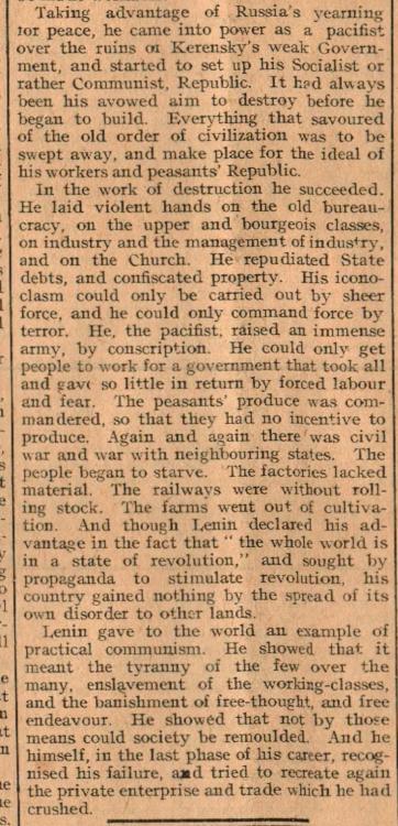 For many months Lenin has been a shadowy figure in the background of Russian politics, a name still to conjure with, but himself ill, half-paralysed, scarcely able to make his wishes known and evidently approaching his end. And now he has died. He lived just long enough to learn that the theory which he had held persistently from early manhood, and had forced relentlessly on his country, could not even by a dictator be made workable.