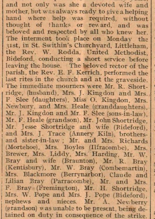 It is with feelings of deep regret that we record the death of Mrs Shortridge, the beloved wife of Mr R Shortridge, of Heale Cottage, Littleham. She had been in failing health for some years but only took to her bed for the last time on December 29th, and in spite of careful nursing and assiduous attention passed over in the early hours of the morning of January 17, in the presence of her husband and two daughters. Mrs Shortridge had been a resident of the parish for close on fifty years…