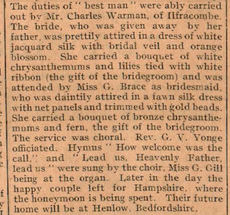 A very pretty wedding was solemnised at St Michael’s Church, Horwood, between Mr Reginald J Cutland, of Romsey, and Miss Annie Cutland, only daughter of Mr and Mrs J Cutland, Lovacott, Newton Tracey.