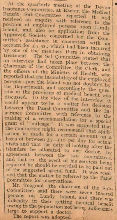 Mr Dennis Kent, Langtree, is to be congratulated on the splendid sum he has collected in this parish for the Barnstaple Infirmary, viz. £13 15s 6d. The Langtree Male Voice Choir and Concert Party entertained at Beaford Baptist Chapel and at Newton St Petrock.