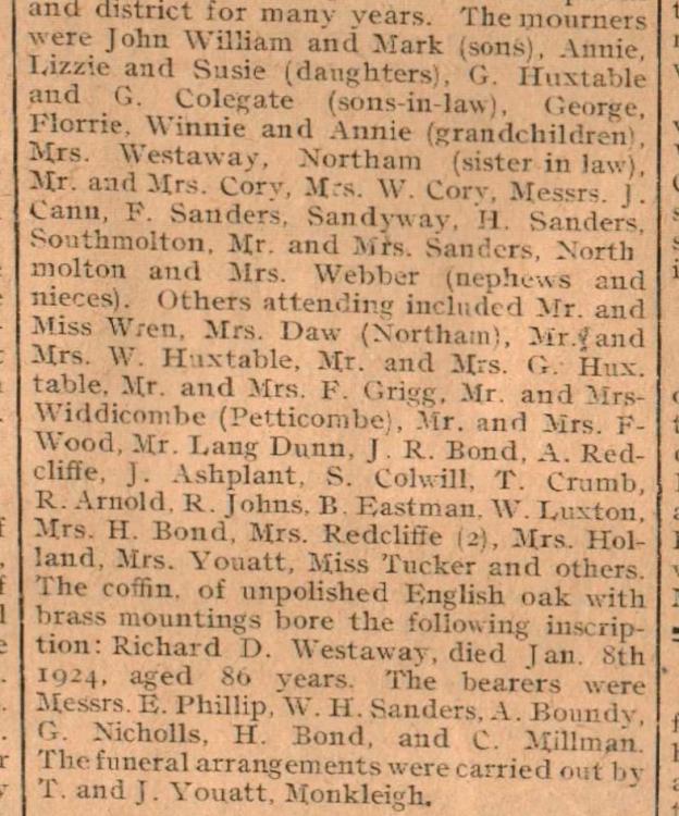 The funeral of Mr Richard Drew Westaway took place at Monkleigh, the last rites being performed by the Vicar, Rev Evelyn Smith. The deceased was well known having resided in the parish and district for many years. The mourners were….