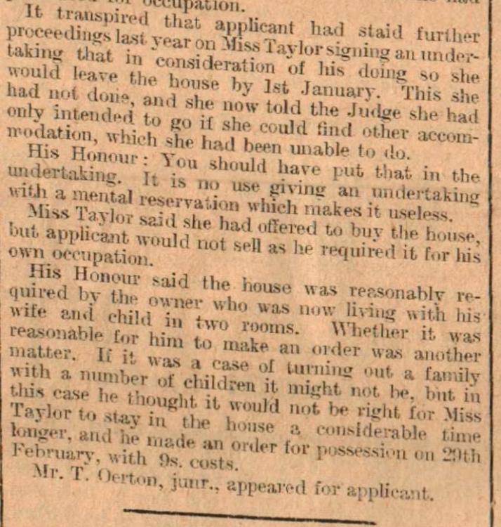 His Honour Judge Lindley again had before him at Bideford County Court a house possession case in which A H Lillicrap, a motor engineer, now in rooms at Bank House, Northam, sought an ejectment order against Miss Laura Taylor, in respect to a house in Tower-street which he had purchased for occupation.