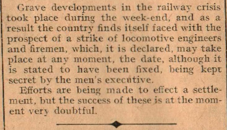 Owing to the dislocation of the train services deliveries and despatches will be very irregular. The 1st delivery will be made if the train service permits at about 9am, and will include correspondence from all parts. A 2nd delivery will be made at about 3pm and will as a rule include local postings only. A despatch is made every morning at about 8am, but an evening despatch cannot be guaranteed. Two days last week there was no train service in the evening. A notice will appear in the Head Office window each day as to the latest hour of posting and the arrangements for the day.