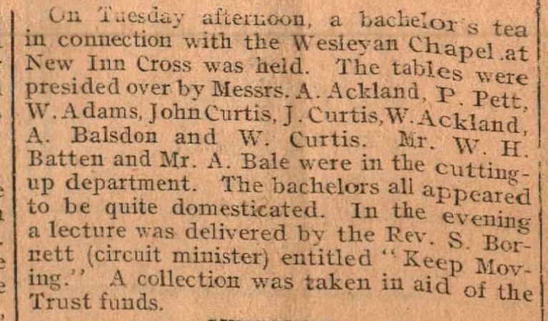 A bachelor’s tea at the New Inn Cross, Shebbear, was held.