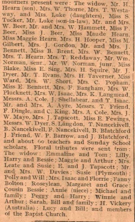 During the past week another prominent Torrington worthy passed away, viz. Mr Henry Hearn, aged 72 years, of Louisa Terrace, New-street, who had been incapacitated from work for some years. He was a life-long member of the Baptist Church, and once Superintendent and Sunday School teacher. The funeral was largely attended. Rev J M Mayo (pastor) officiated, whilst the acting bearers were sidesmen of the Church – Messrs J Tapscott, T J Dyer, C Popham, A Cole, J Barnacott and J Slocombe. The immediate family…