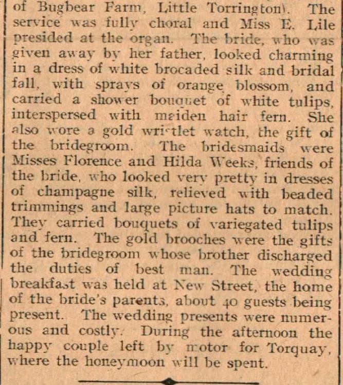A very pretty wedding was solemnised in the Wesleyan Church, Torrington, by Rev Reynolds, the contracting parties being Mr Henry Mills, son of Mr and Mrs William Mills, Petrockstowe, and Miss Alice May, only daughter of Mr and Mrs W Adams, New Street, Torrington, late of Bugbear Farm, Little Torrington.