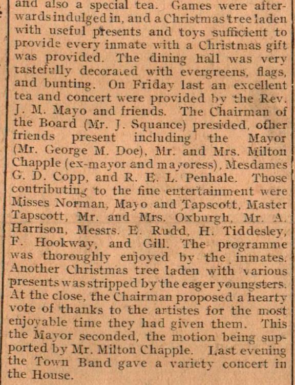 No detail was forgotten by those responsible for the Christmas arrangements for the entertainment of the inmates of the Torrington Workhouse. The Master and Matron, Mr and Mrs Harrison together with the staff, have worked exceedingly hard throughout the festivities and did all in their power to ensure the inmates having a really jolly time. A fine Christmas dinner was provided and also a special tea. Games were afterwards indulged in…