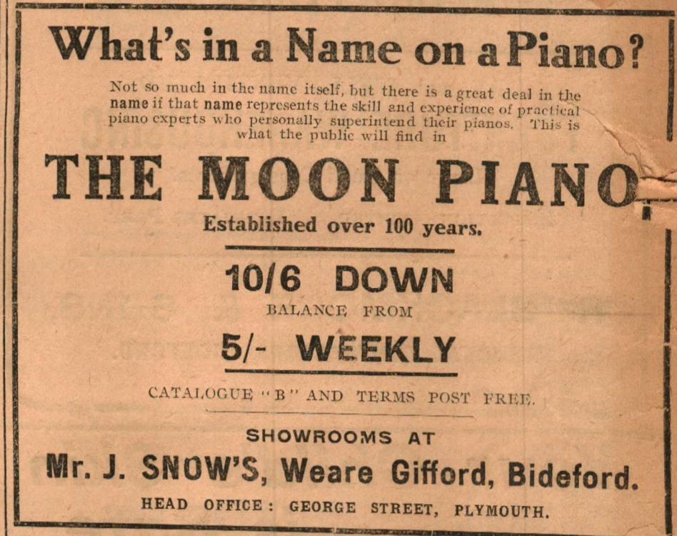 A capital concert was given in the Torrington Town Hall by the Council School children, to raise funds to help pay for a piano recently purchased. A full house made it a great success. A very find programme was submitted. The principals in the plays were: Barbara Furseman, R Baulkwill, N Bromell, M Weeks, V Popham. “Leetle Mr Baggy Breeches” was comical and caused much amusement, the Dutch girl being Phoebe Gist and the Dutch boy Phyllis Hearn, who were called upon for the second time. The girls gave a fine selection of songs, being test pieces sung at the Devon Musical Festival Competition, where they gained the 1st class certificates. The concert was arranged by Miss A Mortlock, Head Mistress of the Girls’ department, to whom great credit is due for the efficient way in which the children had been trained. Before the close Mr C Popham, JP, (Chairman of the Managers) moved a vote of appreciation, which was endorsed by Mr S Webber (Chairman of the Managers). Miss Mortlock acknowledged and thanked them for the remarks. She also thanked the happy band of willing helpers, also Mr Thorne for playing the piano at the practices, and Miss Lile for playing on the occasion.