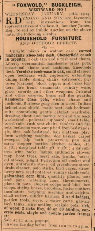 Household furniture and outdoor effects from Foxwold, Buckleigh, Westward Ho! are for sale.