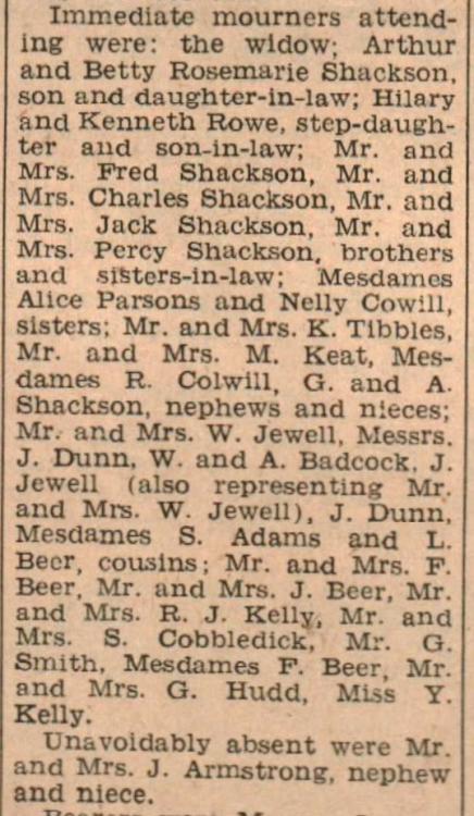 The coffin was covered with the Union Jack at the funeral of ex-Army man Mr Arthur Shackson, at Pandora, Venn, Woolsery. The funeral took place at All Saints’ Church, Clovelly, the Rector, Rev R O H Eppingstone, officiating. The organist was Mr Stevens. Bearers were Messrs Osward Parsons, Reg Cowell, Graham and Anthony Shackson, Kenneth Rowe and Arthur Braund. Many friends attended the service.